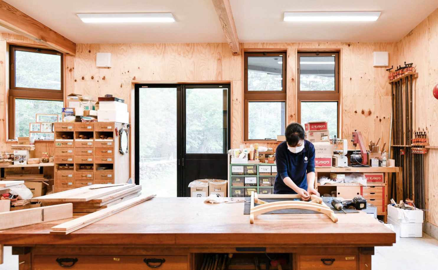 やまとわが活動する長野県伊那市は南アルプスと中央アルプスに囲まれた谷のまちで、森林率が82%という森のまち。森林ディレクターの奥田さんによれば、やまとわの企業理念は「森をつくる暮らしをつくる」で、4つの事業部で構成されているとのこと。夏は農業、冬は林業を実践する「農と森事業部」のほか、地域の木を使った家具やプロダクトをつくる「木工事業部」、地域に合った暮らしを考えて実装する「暮らし事業部」、持続可能な森をつくるための企画づくりの「森事業部」の4つだそうです。